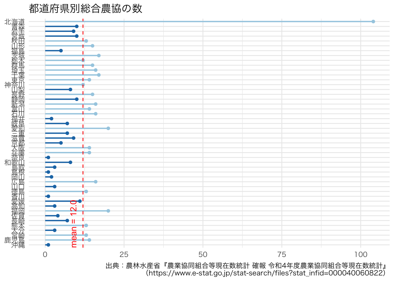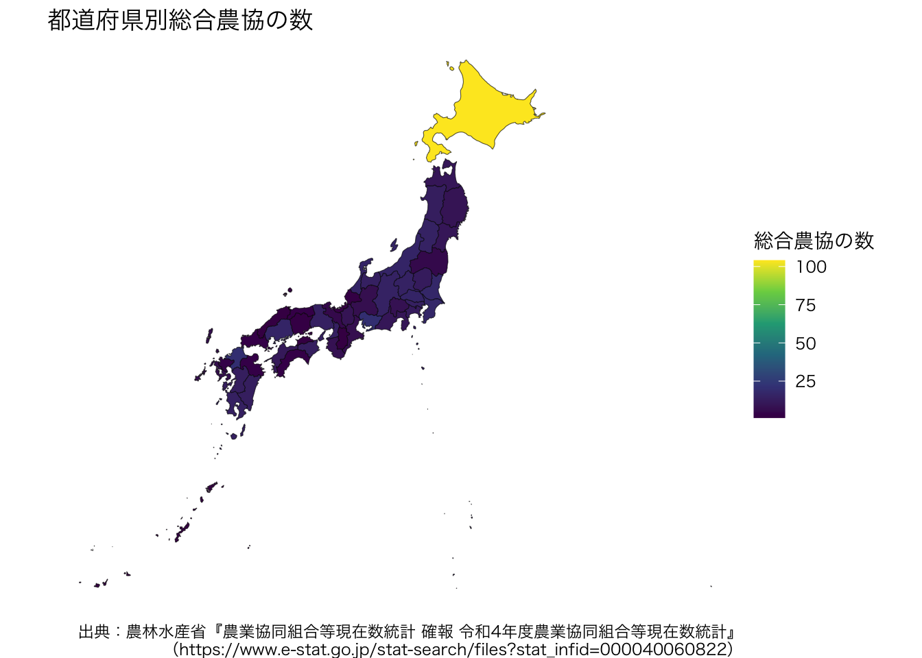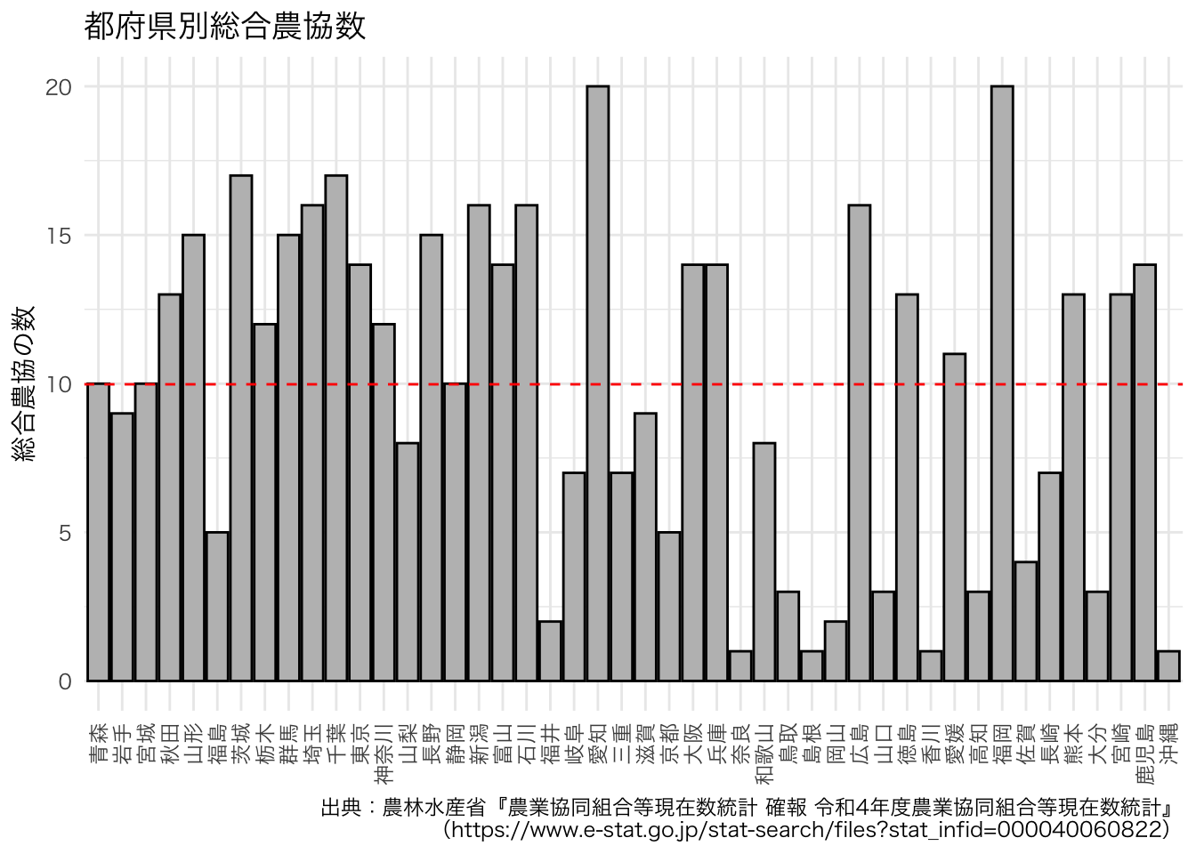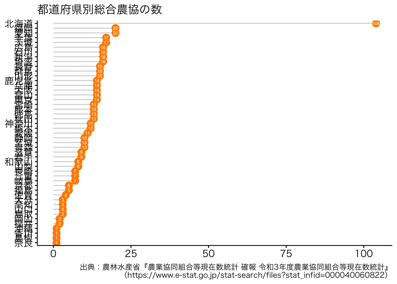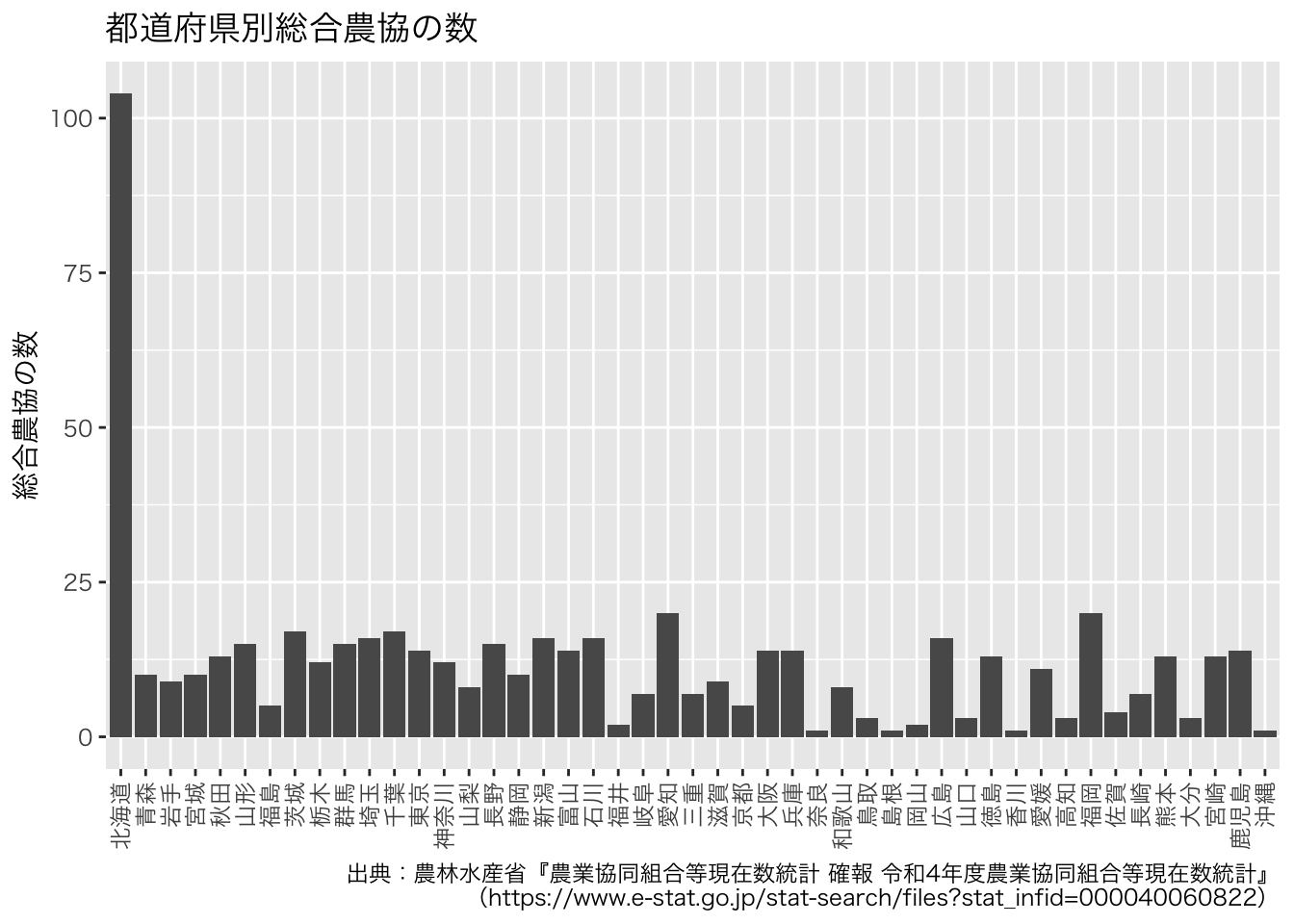 ここでは,都道府県ごとの農業協同組合の数の視覚的な把握を試みます。