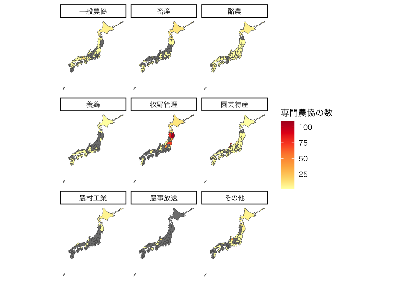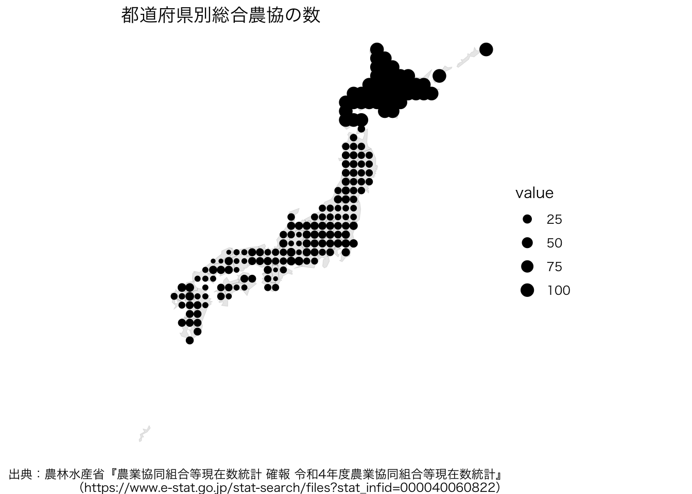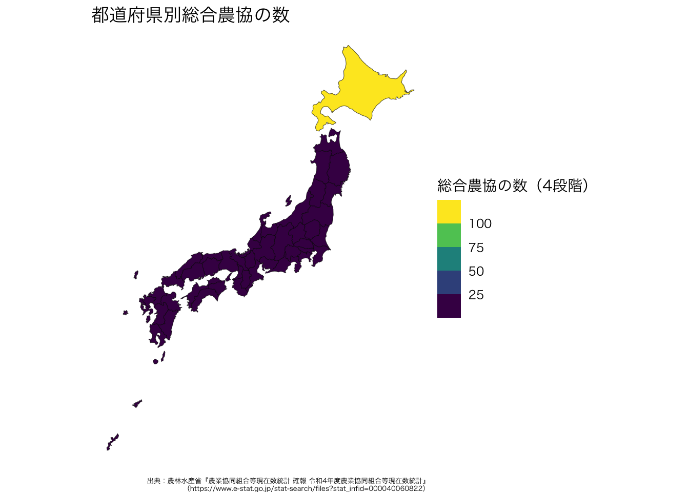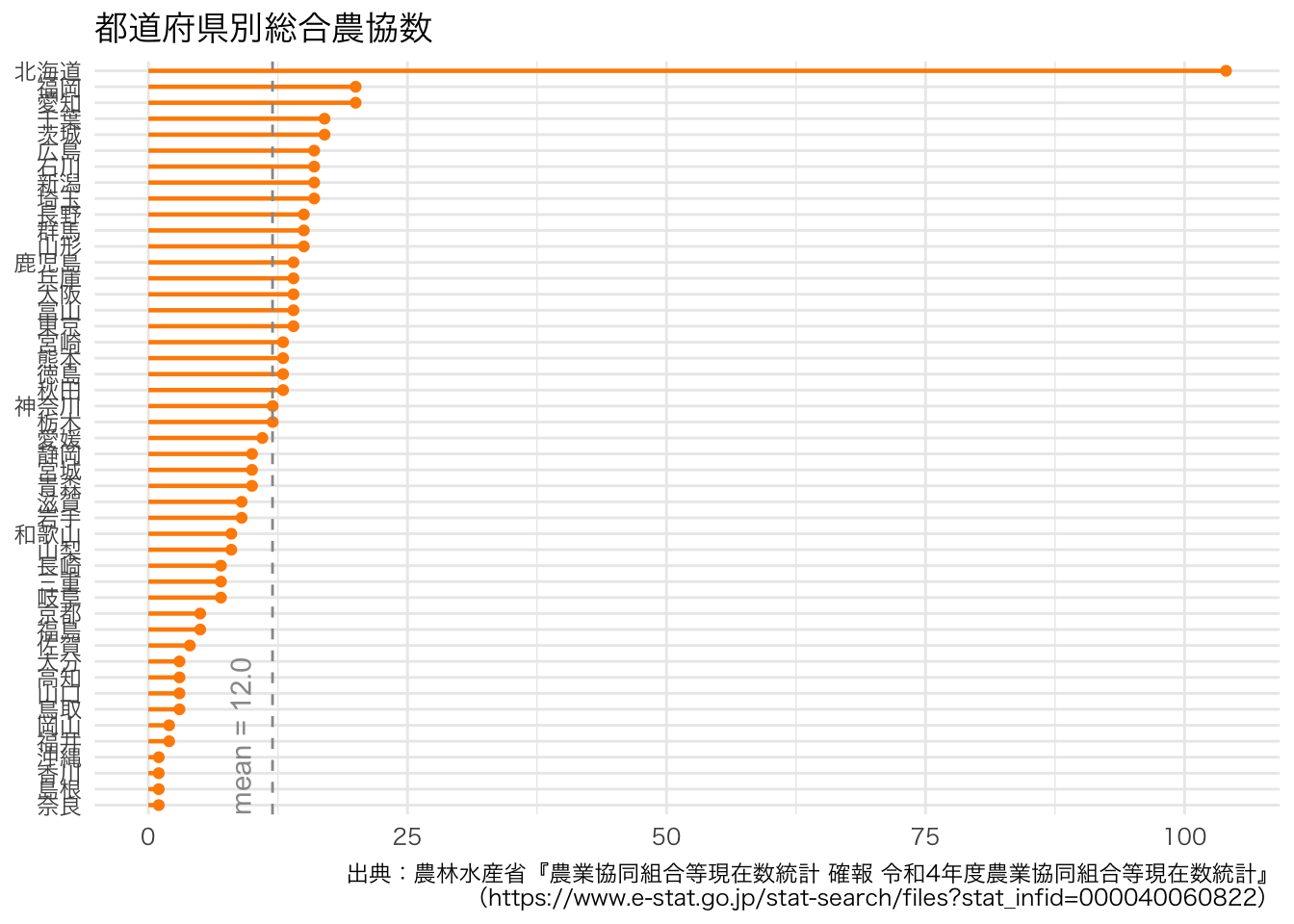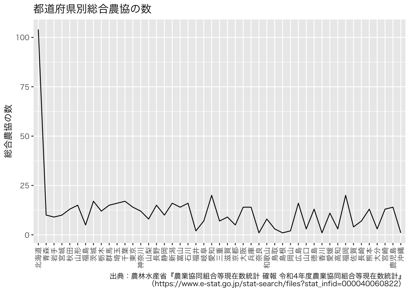 ここでは,都道府県ごとの農業協同組合の数の視覚的な把握を試みます。