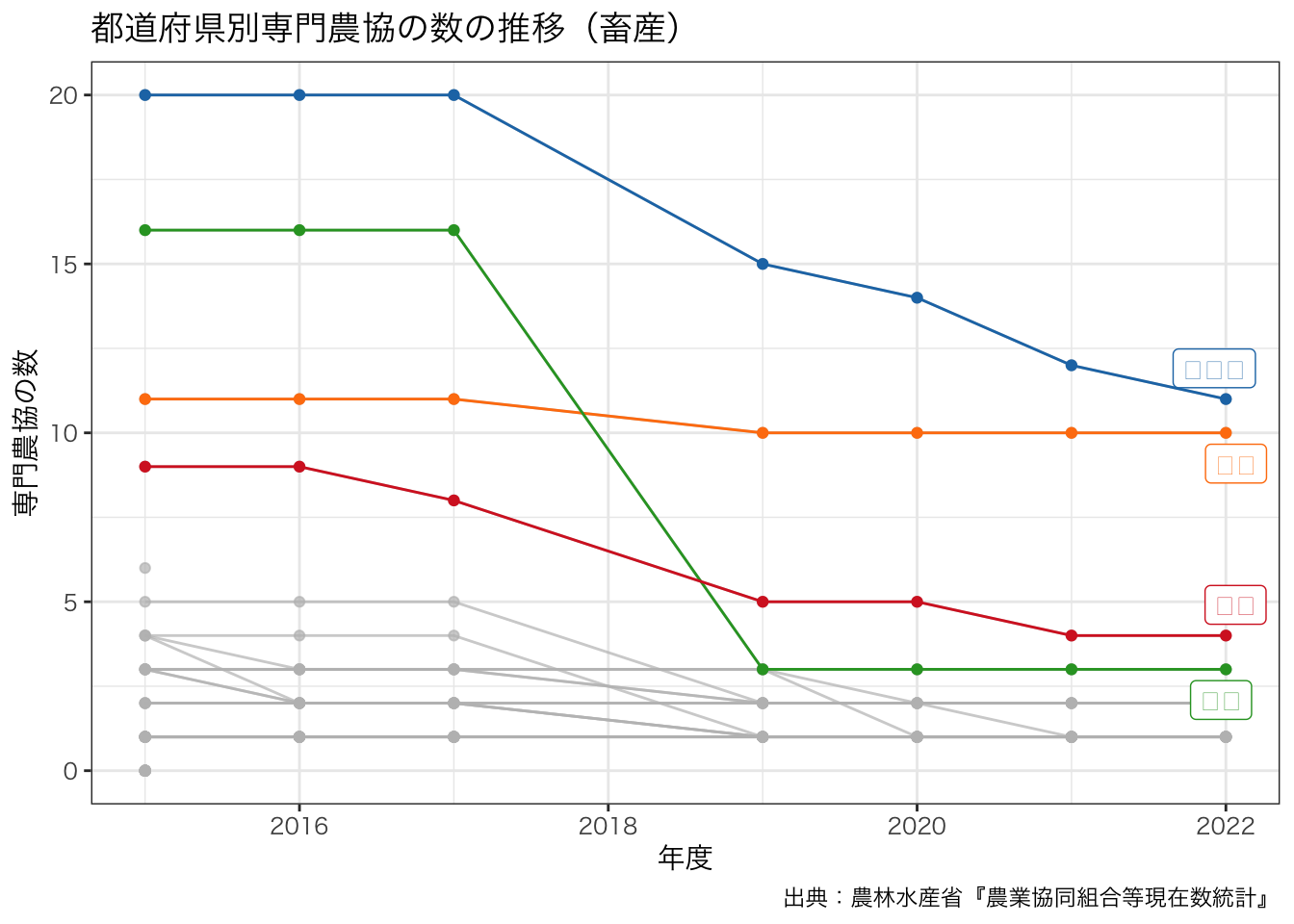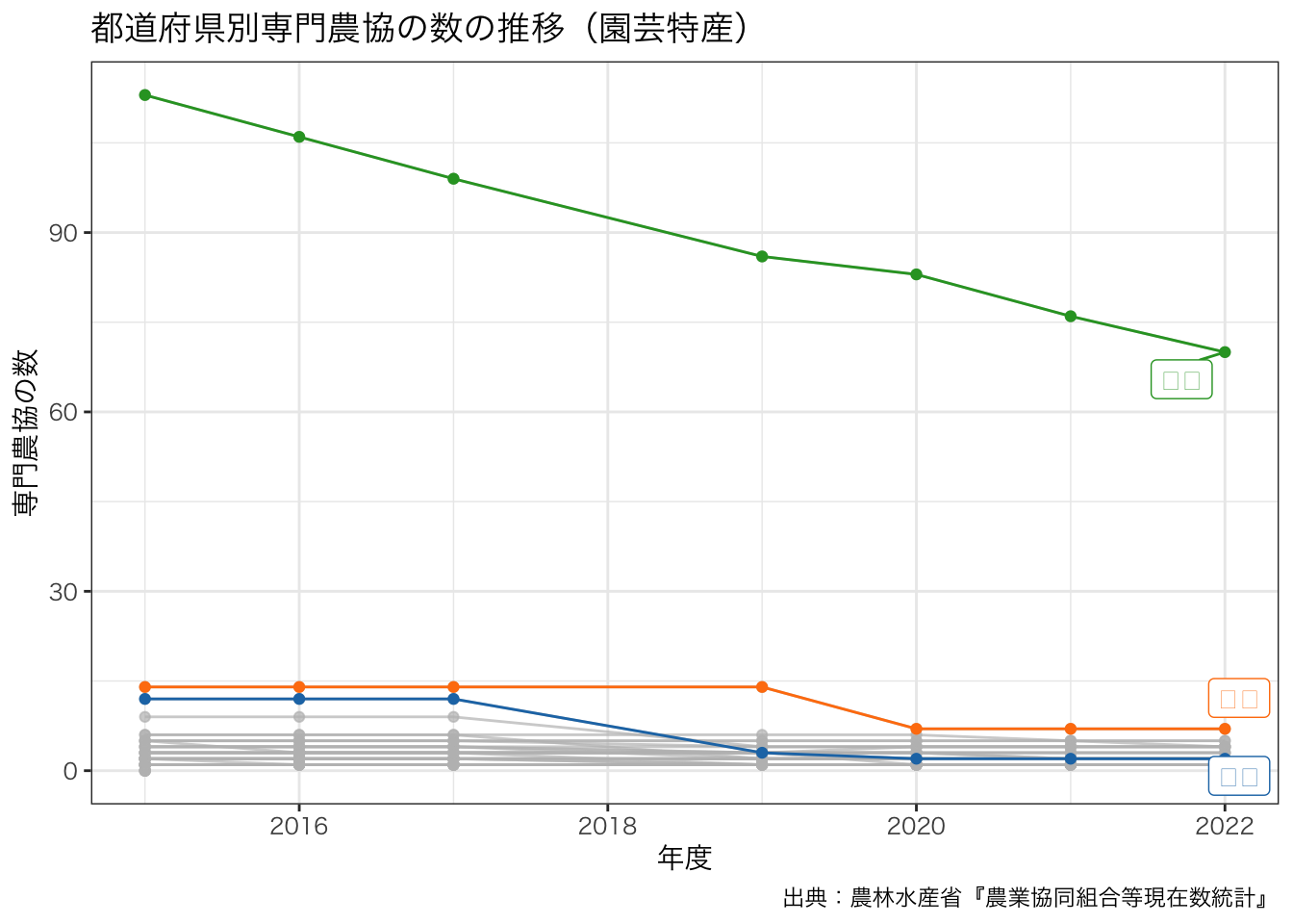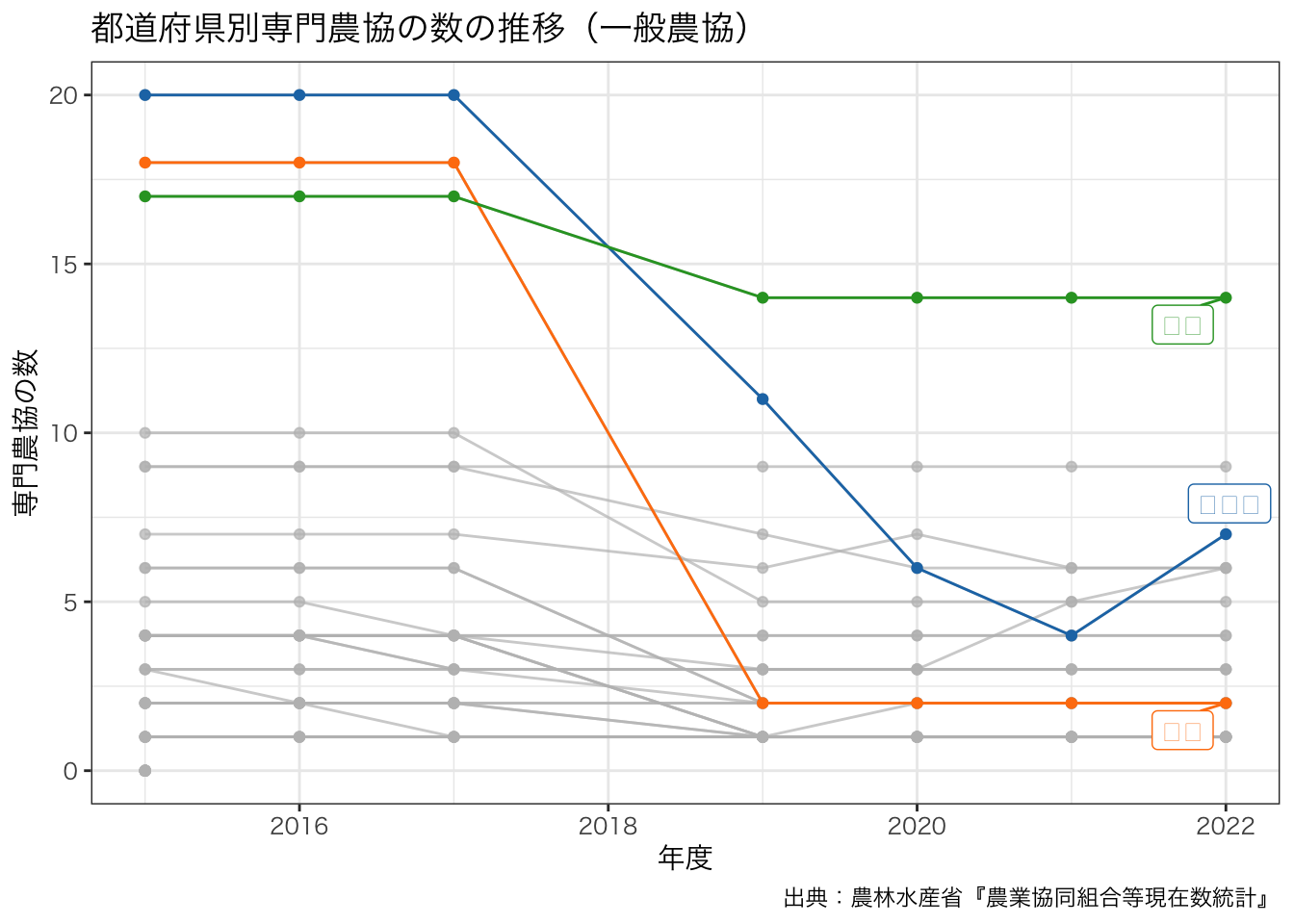 title = paste0 ("都道府県別専門農協の数の推移" , "(" , levels (df_senmon2$ 区分)[4 ], ")" ),