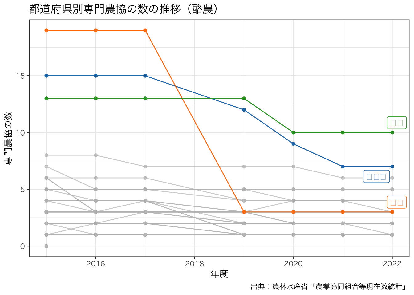 title = paste0 ("都道府県別専門農協の数の推移" , "(" , levels (df_senmon2$ 区分)[7 ], ")" ),