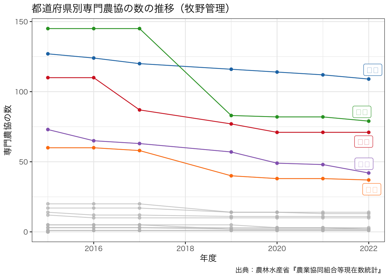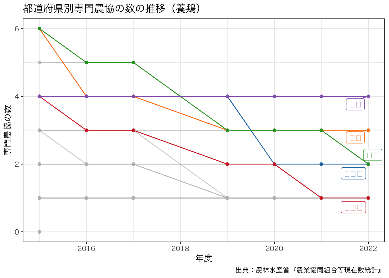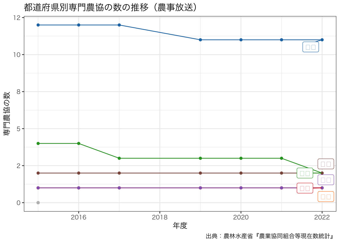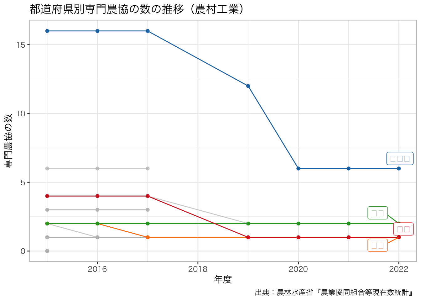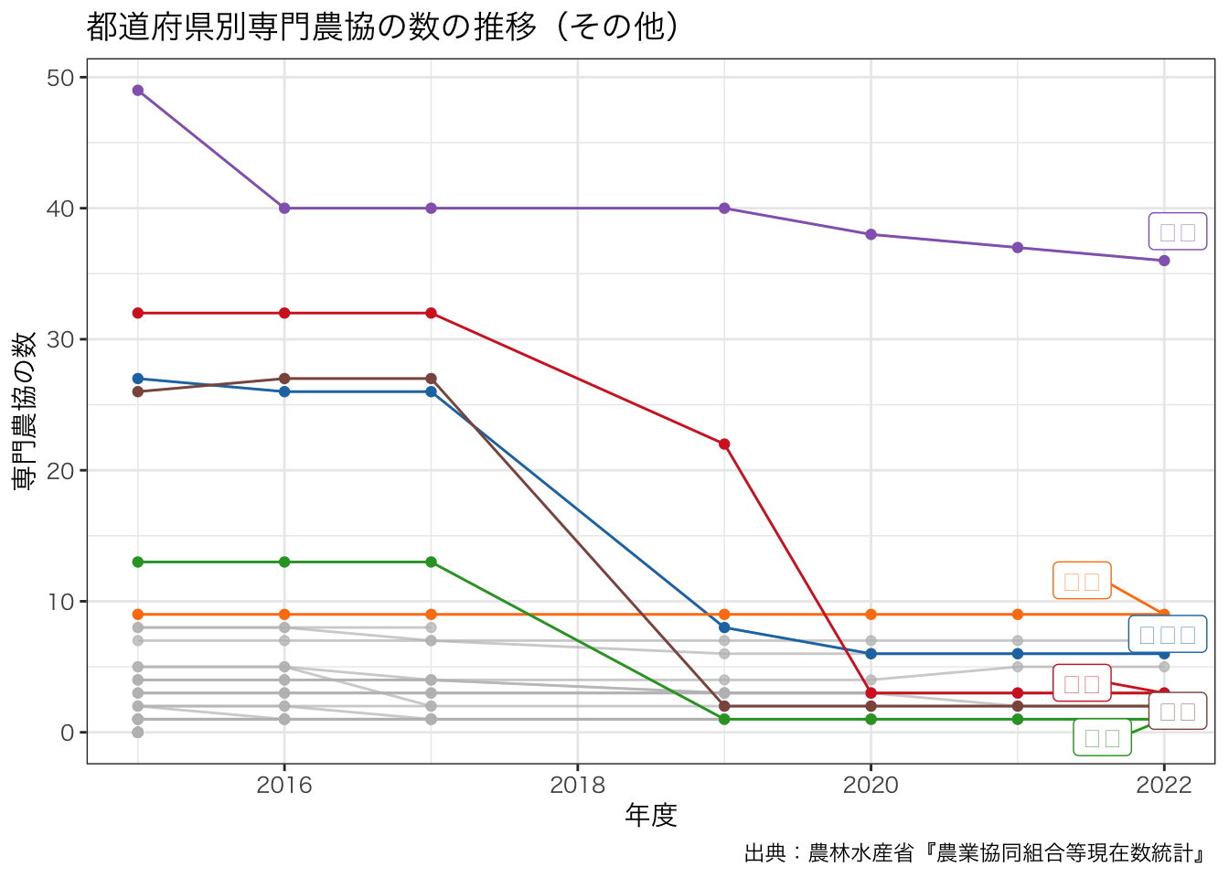 title = paste0 ("都道府県別専門農協の数の推移" , "(" , levels (df_senmon2$ 区分)[6 ], ")" ),